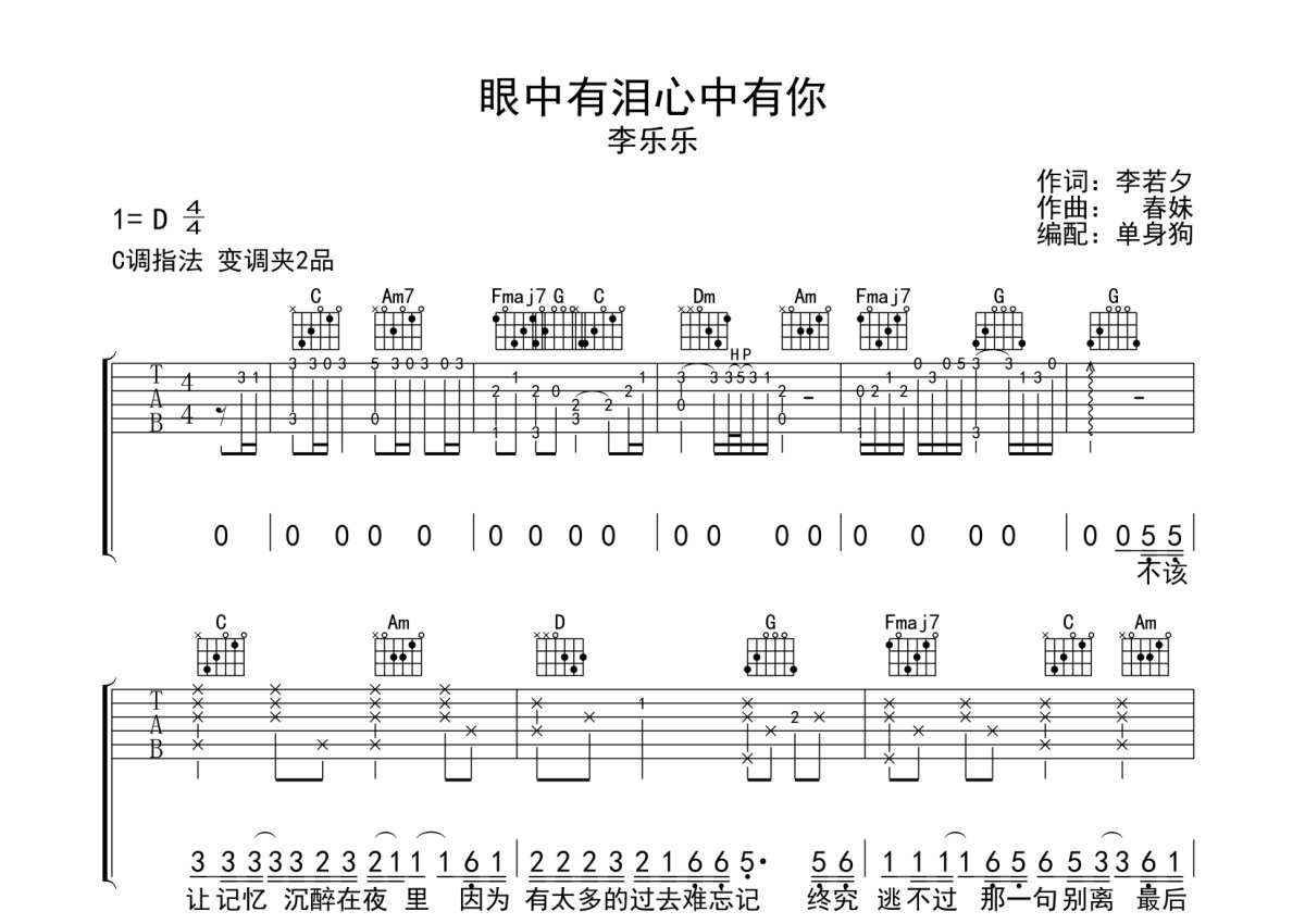 李乐乐《眼中有泪心中有你》吉他谱 - C调弹唱六线谱
