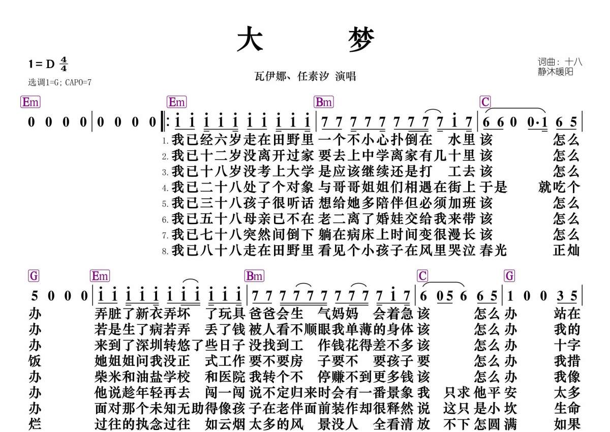 《大梦》是瓦伊娜、任素汐演唱的一首歌曲,和弦谱,拍号为4/4拍,这份简谱共有一张高清图谱,图谱由 @静沐暖阳 编配上传。