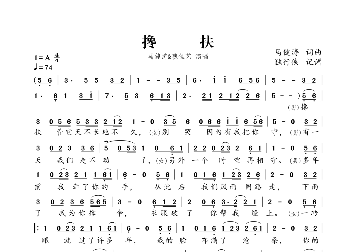 搀扶(对唱版)简谱 - 马健涛、魏佳艺演唱