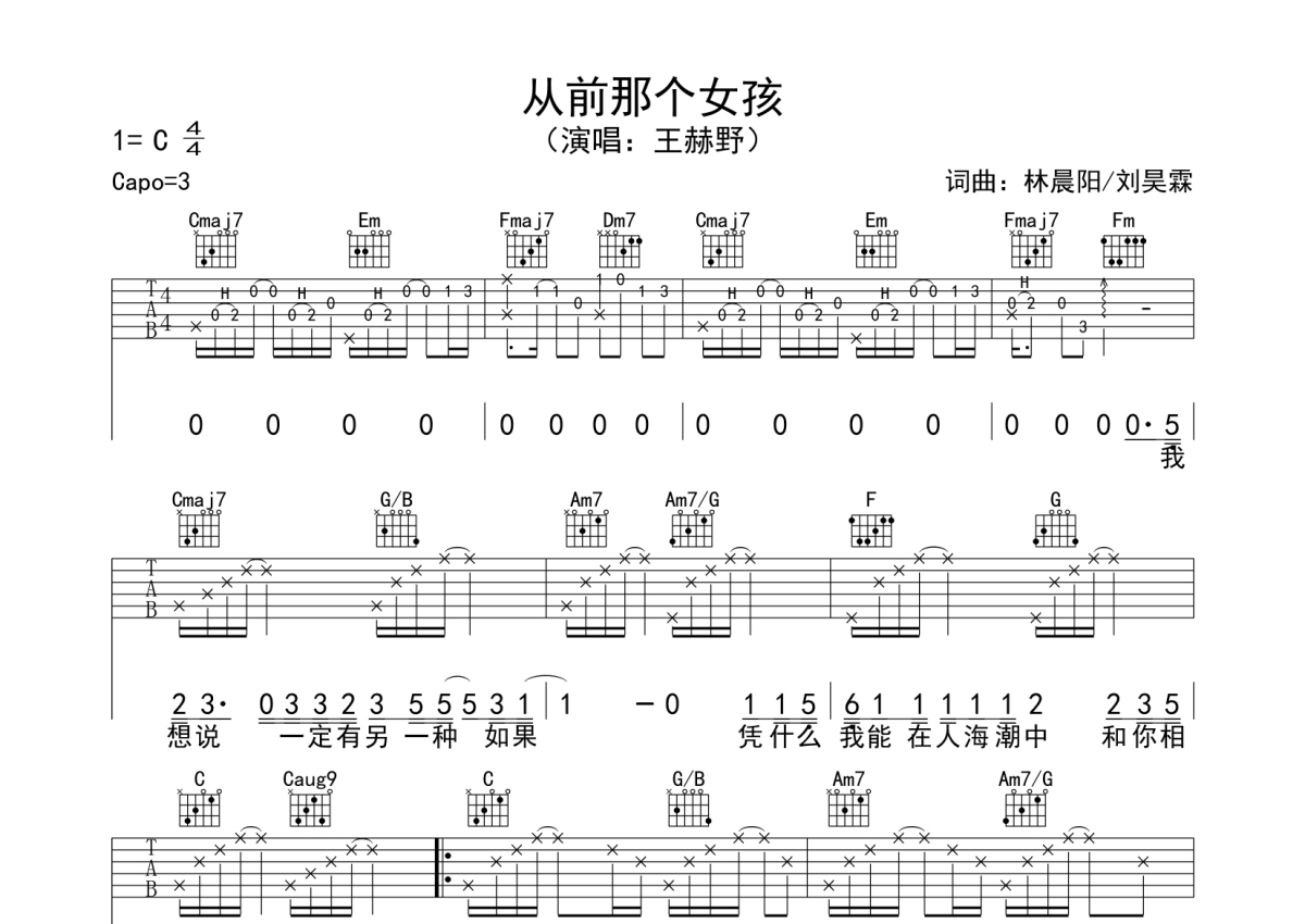 《从前那个女孩》吉他谱 - 王赫野 - C调弹唱六线谱