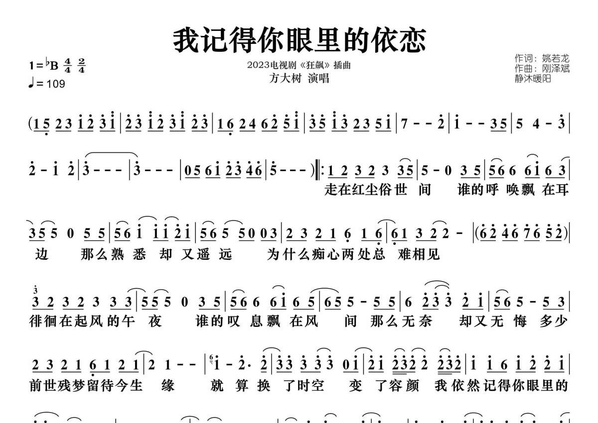 《我记得你眼里的依恋》是方大树演唱的一首歌曲,拍号为4/4拍,歌曲速度为每分钟109拍,这份简谱共有一张高清图谱,图谱由 @静沐暖阳 编配上传。