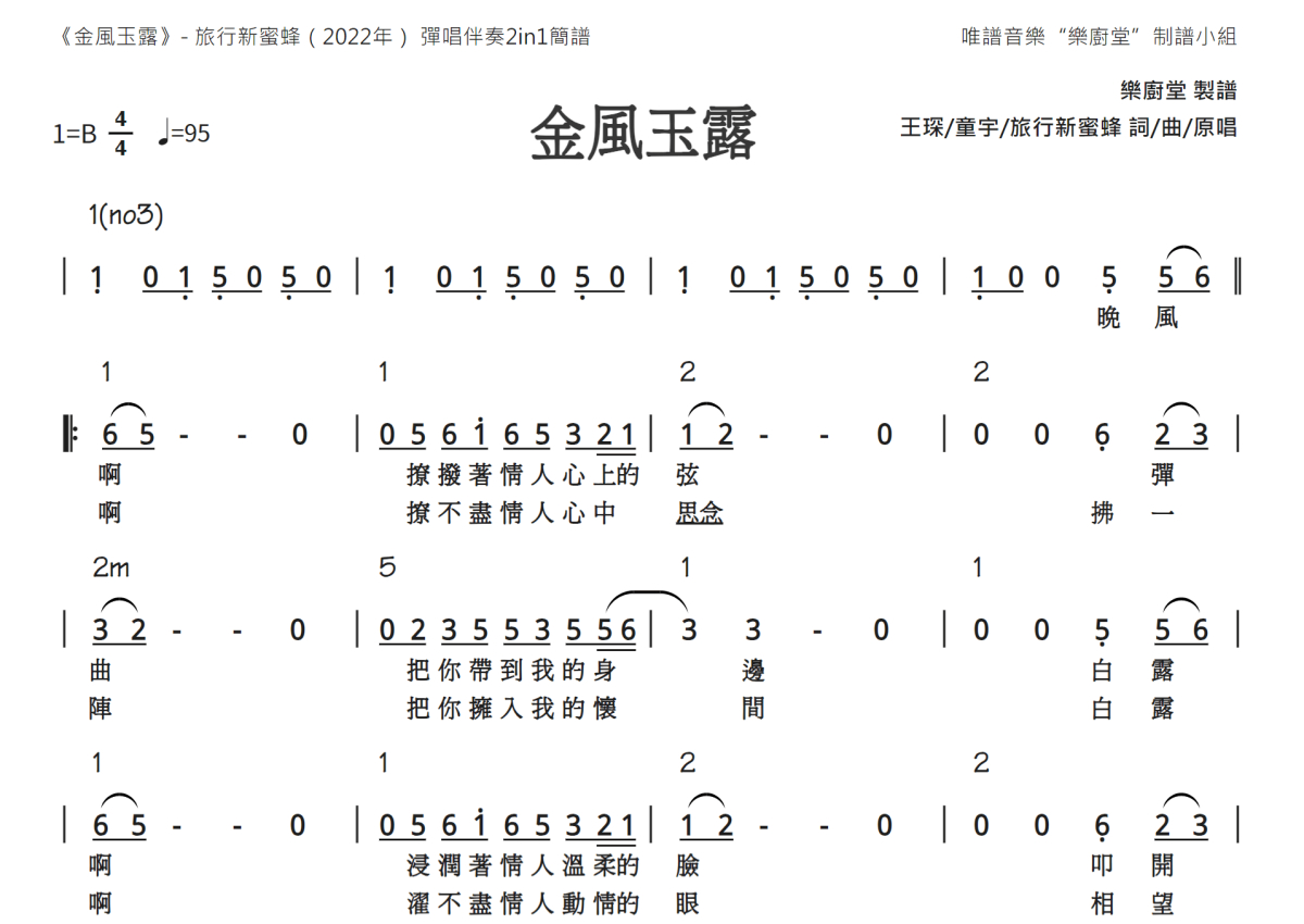 《金风玉露》是旅行新蜜蜂演唱的一首歌曲,和弦简谱,这份简谱共有三张高清图谱,图谱由 @唯谱音乐"乐厨堂"发布小组 编配上传。