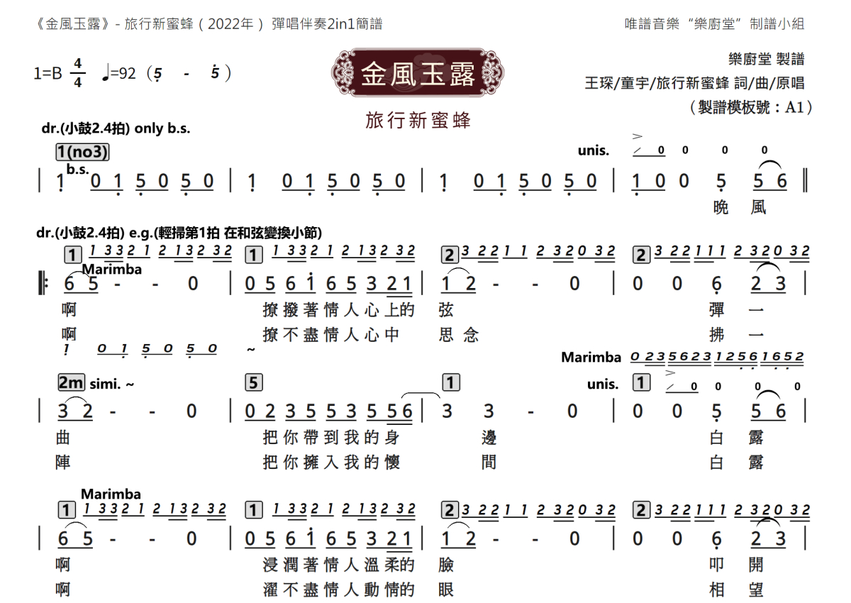 《金风玉露》是旅行新蜜蜂演唱的一首歌曲,这份乐队总谱共有三张高清图谱,图谱由 @唯谱音乐"乐厨堂"发布小组 编配上传。