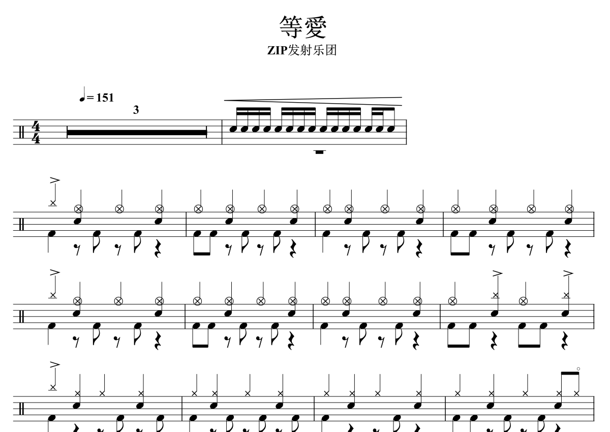 《等爱》是ZIP发射乐团演唱的一首歌曲,拍号为4/4拍,歌曲速度为每分钟151拍,这份架子鼓谱共有四张高清图谱,图谱由 @音符喷血者 编配上传,图谱使用五线谱编配,使用这份等爱架子鼓谱,你将能够轻松地敲打出这首ZIP发射乐团的等爱,快来尝试吧。