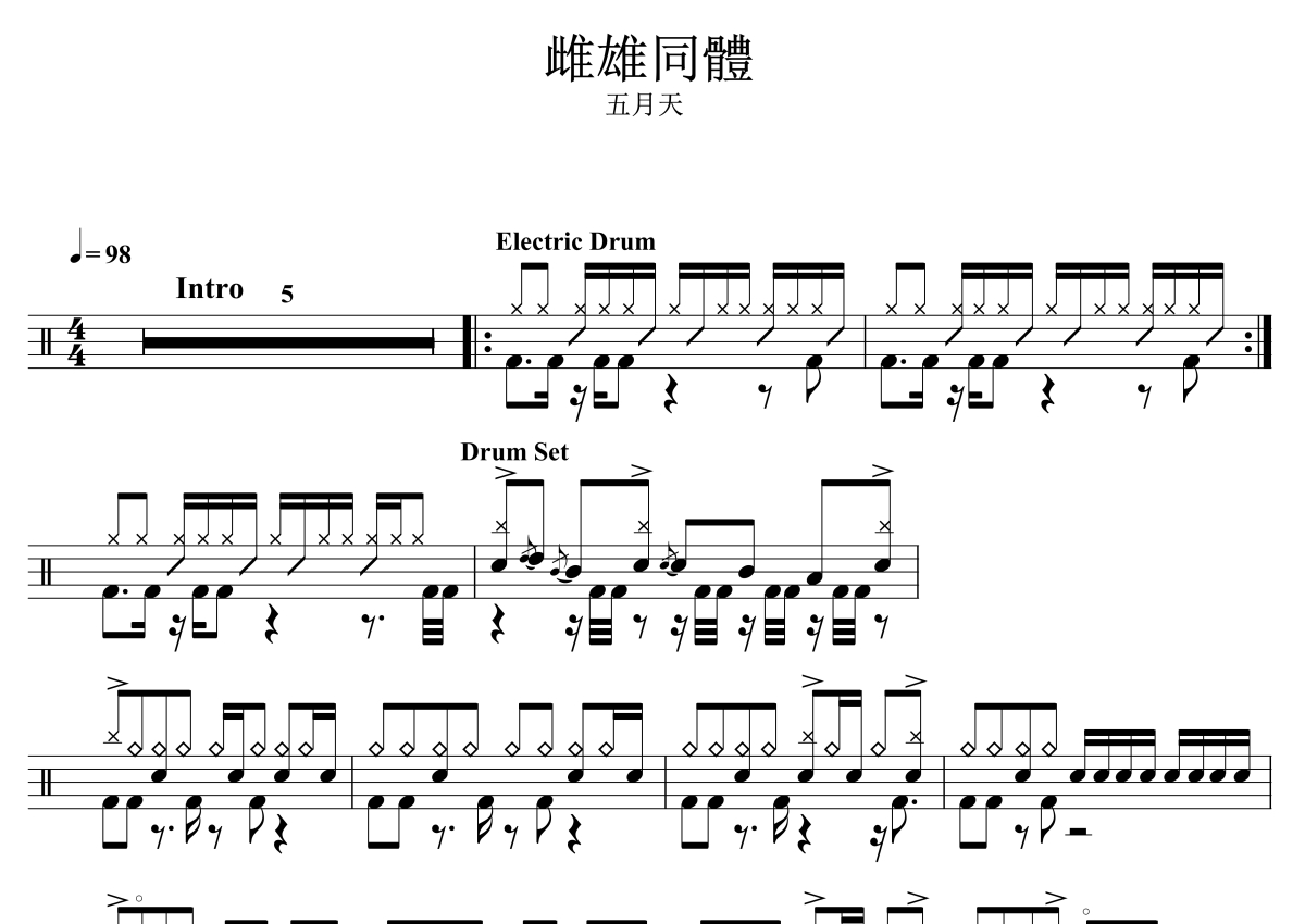 《雌雄同体》是五月天演唱的一首歌曲,拍号为4/4拍,歌曲速度为每分钟98拍,这份架子鼓谱共有四张高清图谱,图谱由 @音符喷血者 编配上传,图谱使用五线谱编配,使用这份雌雄同体架子鼓谱,你将能够轻松地敲打出这首五月天的雌雄同体,快来尝试吧。