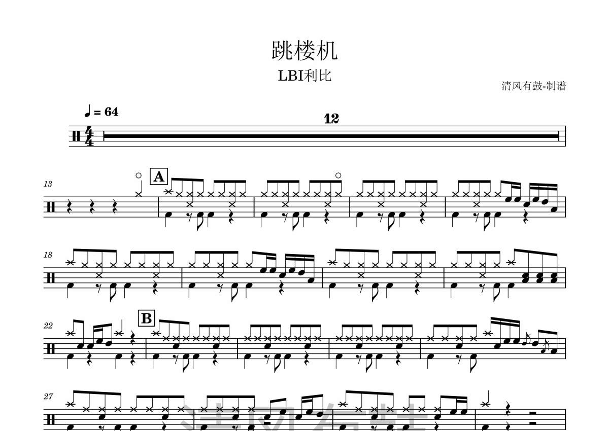 《跳楼机》是LBI利比演唱的一首歌曲,拍号为4/4拍,这份架子鼓谱共有一张高清图谱,图谱由 @清风有鼓 编配上传,图谱使用五线谱编配,使用这份跳楼机架子鼓谱,你将能够轻松地敲打出这首LBI利比的跳楼机,快来尝试吧。