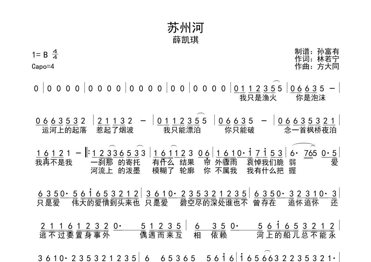 《苏州河》是薛凯琪演唱的一首歌曲,拍号为4/4拍,这份简谱共有一张高清图谱,图谱由 @SRV7758521 编配上传。