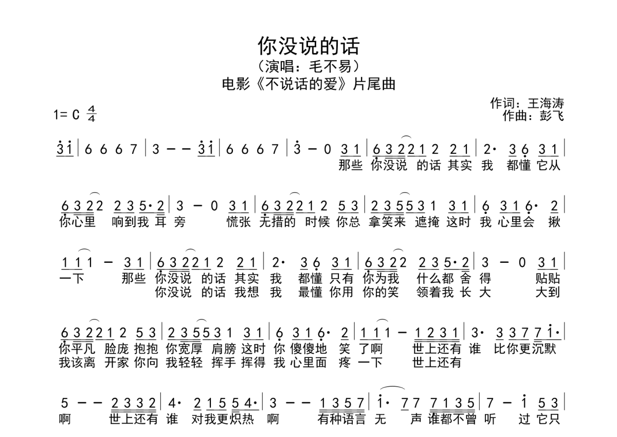 《你没说的话》是毛不易演唱的一首歌曲,拍号为4/4拍,这份简谱共有一张高清图谱,图谱由 @SRV7758521 编配上传。