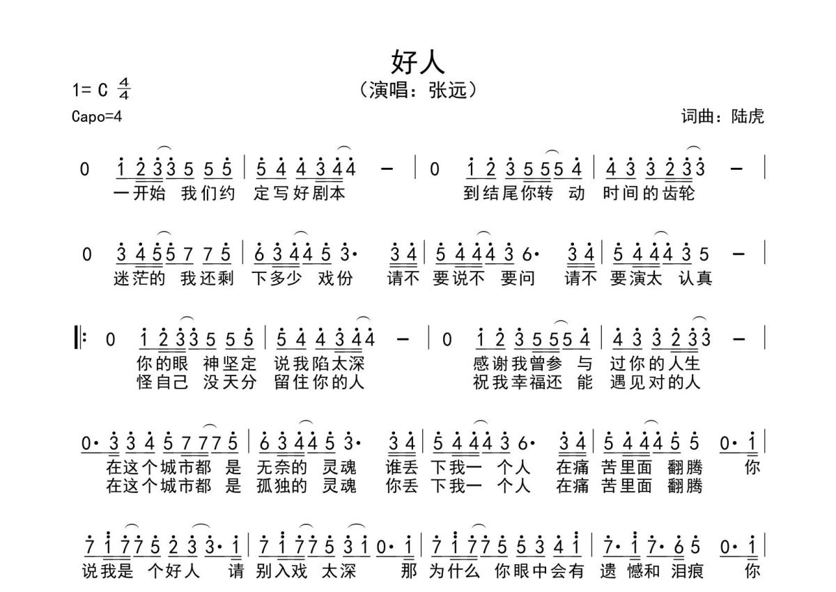 好人简谱 - 张远演唱