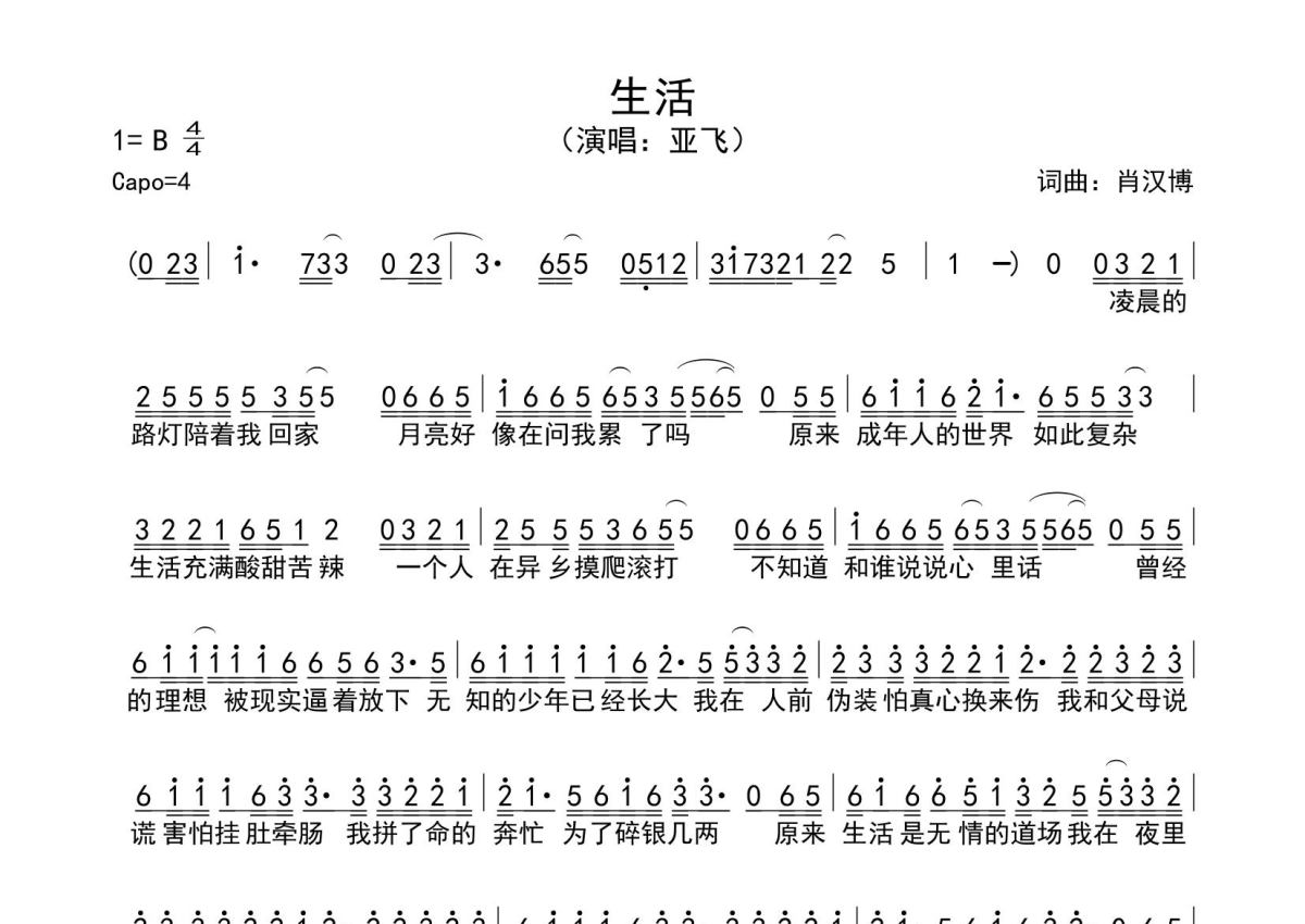 《生活》是亚飞演唱的一首歌曲,拍号为4/4拍,这份简谱共有一张高清图谱,图谱由 @SRV7758521 编配上传。