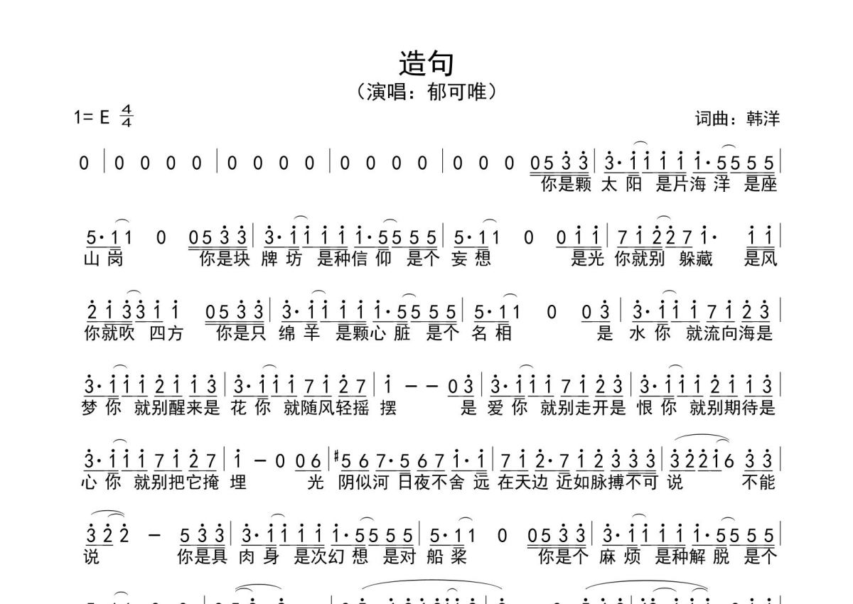 《造句》是郁可唯演唱的一首歌曲,拍号为4/4拍,这份简谱共有一张高清图谱,图谱由 @SRV7758521 编配上传。
