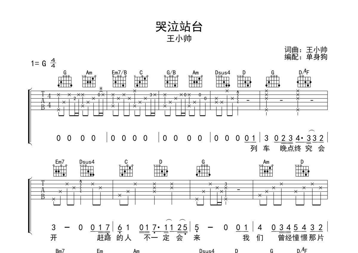 王小帅《哭泣站台》吉他谱 - G调弹唱六线谱