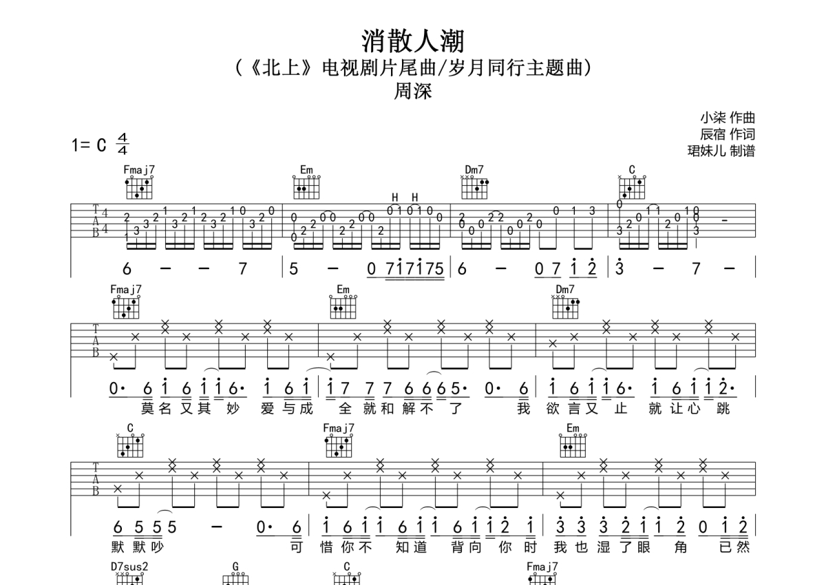 《消散人潮》是周深演唱的一首歌曲,拍号为4/4拍,歌曲速度为每分钟85拍,歌曲原调为C调,本吉他谱采用的是C调指法编配,演奏时不需要使用变调夹即为原调,这份吉他谱共有两张高清图谱,图谱由 @珺妹儿 编配上传,图谱使用六线谱编配,包含吉他和弦指法、简谱以及歌词部分,使用这份消散人潮吉他谱,可以让你更加方便地掌握这首歌曲的弹唱技巧,快来尝试吧。