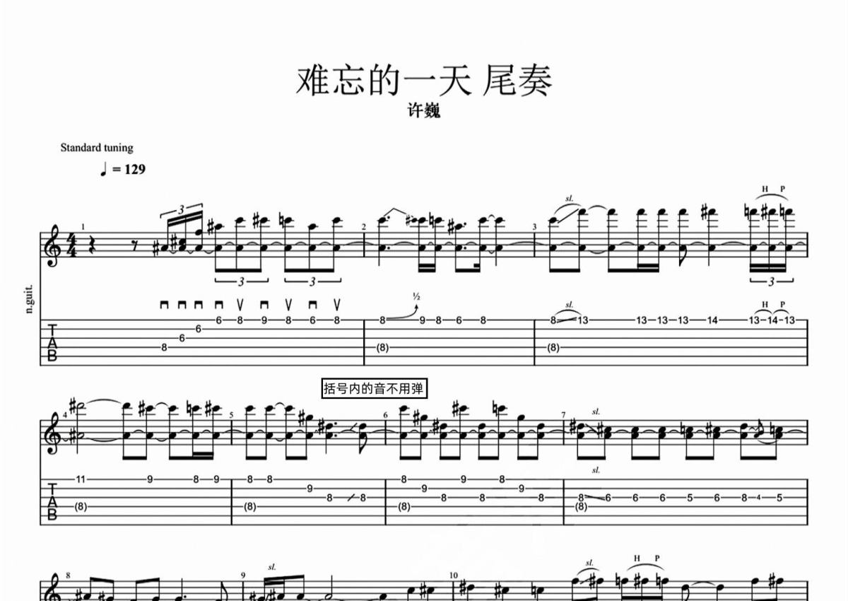 许巍《难忘的一天》吉他谱 - C调独奏solo六线谱