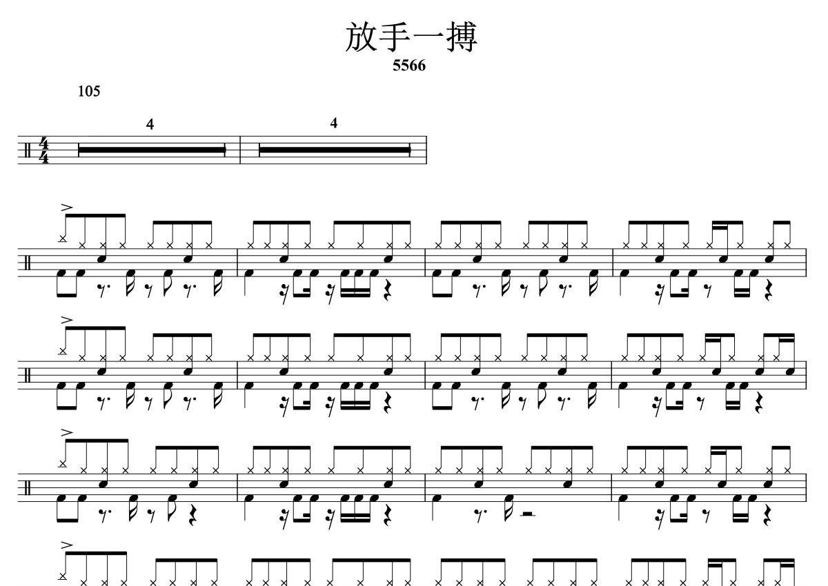 《放手一搏》是5566演唱的一首歌曲,拍号为4/4拍,歌曲速度为每分钟105拍,这份架子鼓谱共有两张高清图谱,图谱由 @音符喷血者 编配上传,图谱使用五线谱编配,使用这份放手一搏架子鼓谱,你将能够轻松地敲打出这首5566的放手一搏,快来尝试吧。