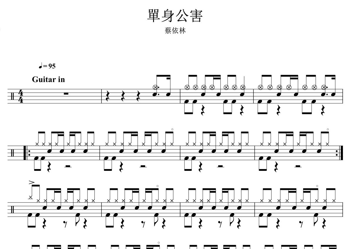 《單身公害》是蔡依林演唱的一首歌曲,拍号为4/4拍,歌曲速度为每分钟95拍,这份架子鼓谱共有三张高清图谱,图谱由 @音符喷血者 编配上传,图谱使用五线谱编配,使用这份單身公害架子鼓谱,你将能够轻松地敲打出这首蔡依林的單身公害,快来尝试吧。