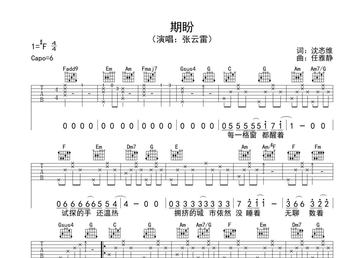 《期盼》是张云雷演唱的一首歌曲,本吉他谱采用的是C调指法编配,这份吉他谱共有两张高清图谱,图谱由 @SRV7758521 编配上传,图谱使用六线谱编配,包含吉他和弦指法、简谱以及歌词部分,使用这份期盼吉他谱,可以让你更加方便地掌握这首歌曲的弹唱技巧,快来尝试吧。