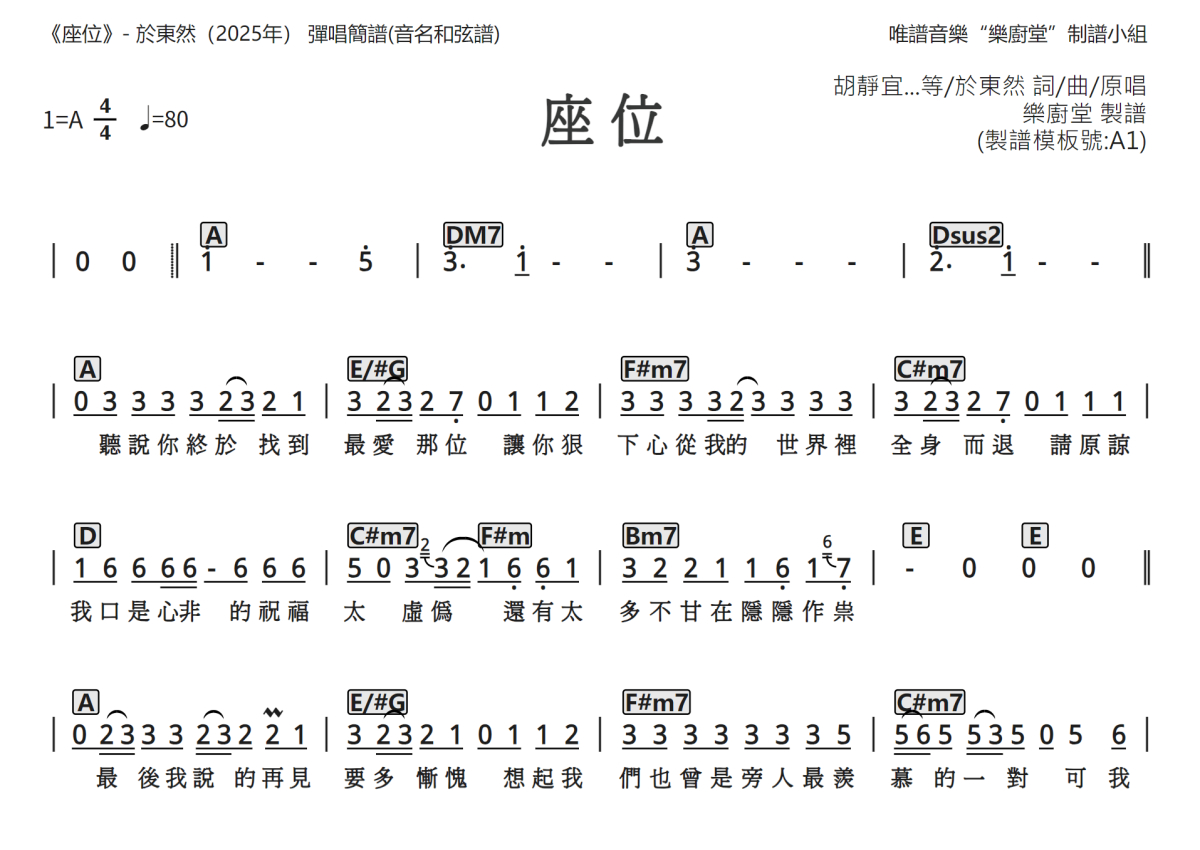 于东然《座位》简谱 - 音名和弦谱