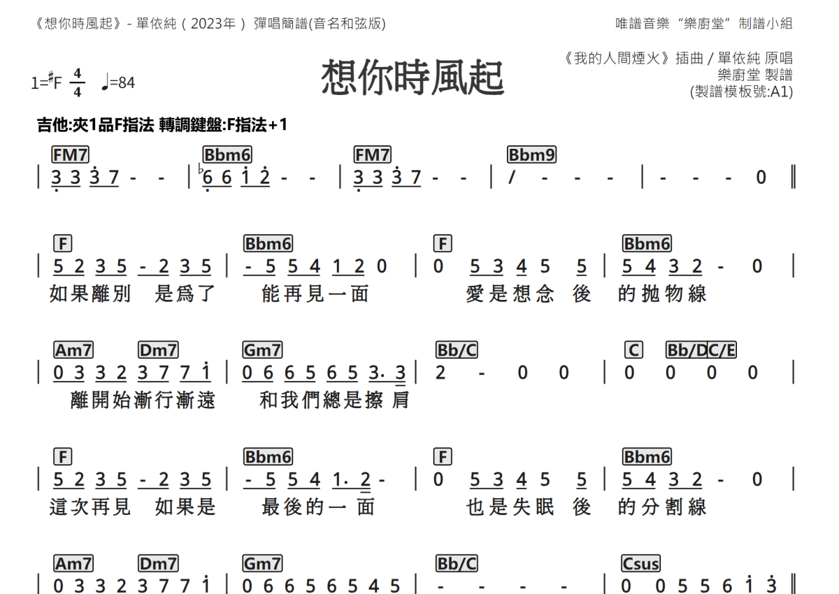《想你时风起》是单依纯演唱的一首歌曲,音名和弦谱,这份简谱共有三张高清图谱,图谱由 @唯谱音乐"乐厨堂"发布小组 编配上传。