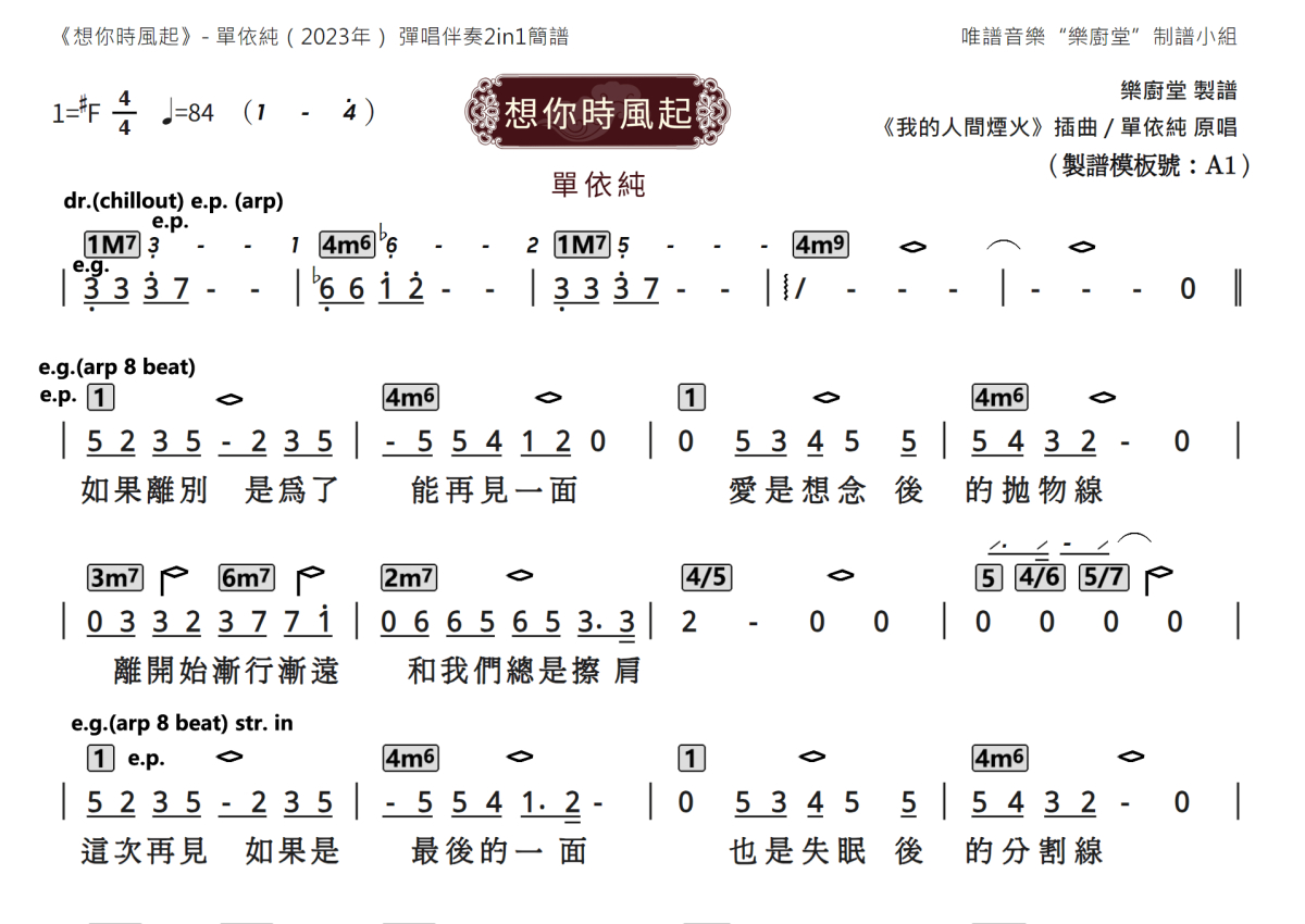“乐厨堂”乐谱发布小组: 出版级乐谱扒谱制谱——以职业乐手圈通行标准记谱,遵循原版和声、伴奏元素和段落结构。 ❶ 2.0多功能专业团谱:采用台湾卓著公司开创的二代简谱标准制作。二代简谱无疑是迄今为止最科学、最易读的专业范畴多功能记谱方案:❷ 框架谱:采用职业乐手通常记谱方案制作。
