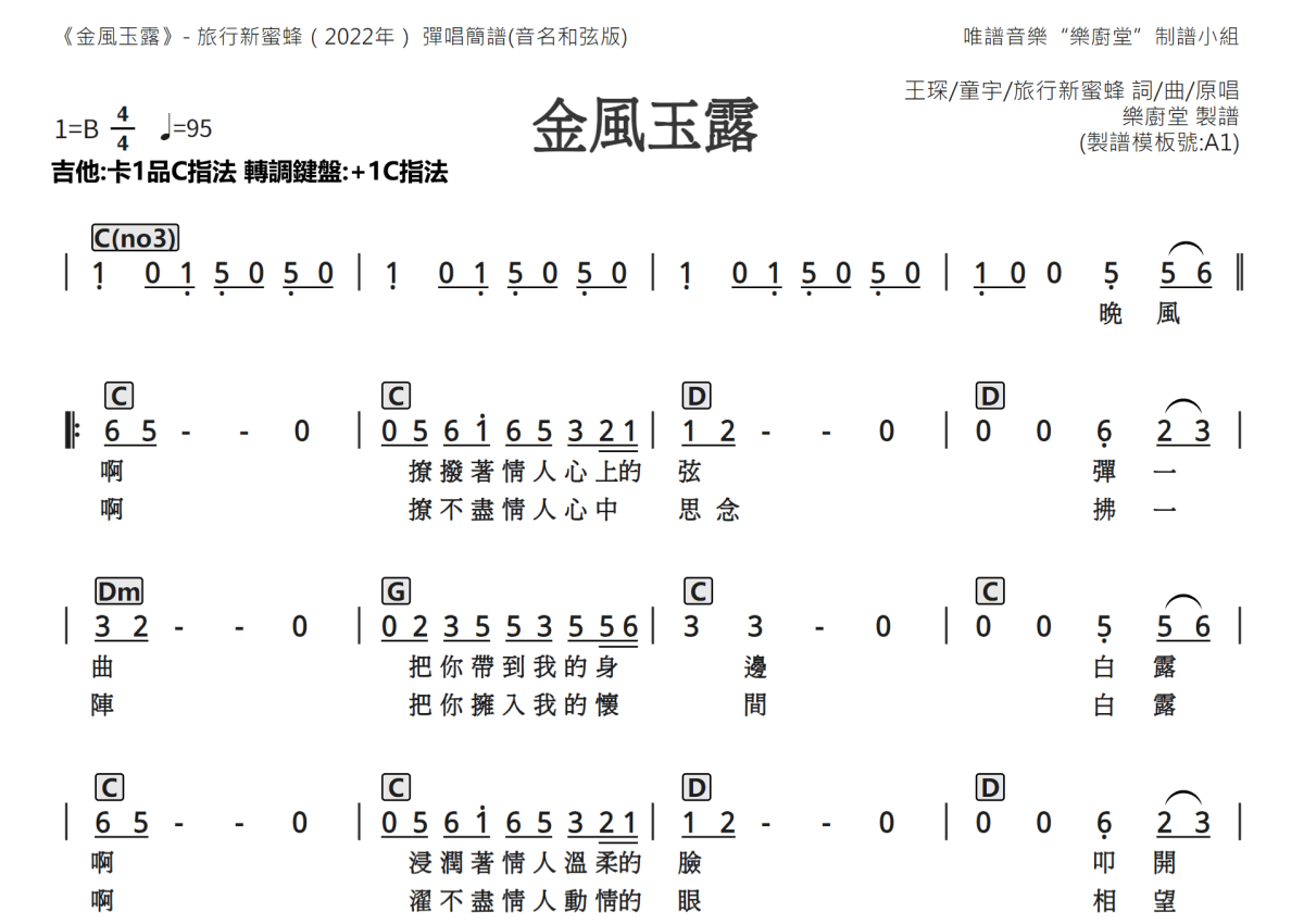 《金风玉露》是旅行新蜜蜂演唱的一首歌曲,音名和弦谱,这份简谱共有三张高清图谱,图谱由 @唯谱音乐"乐厨堂"发布小组 编配上传。