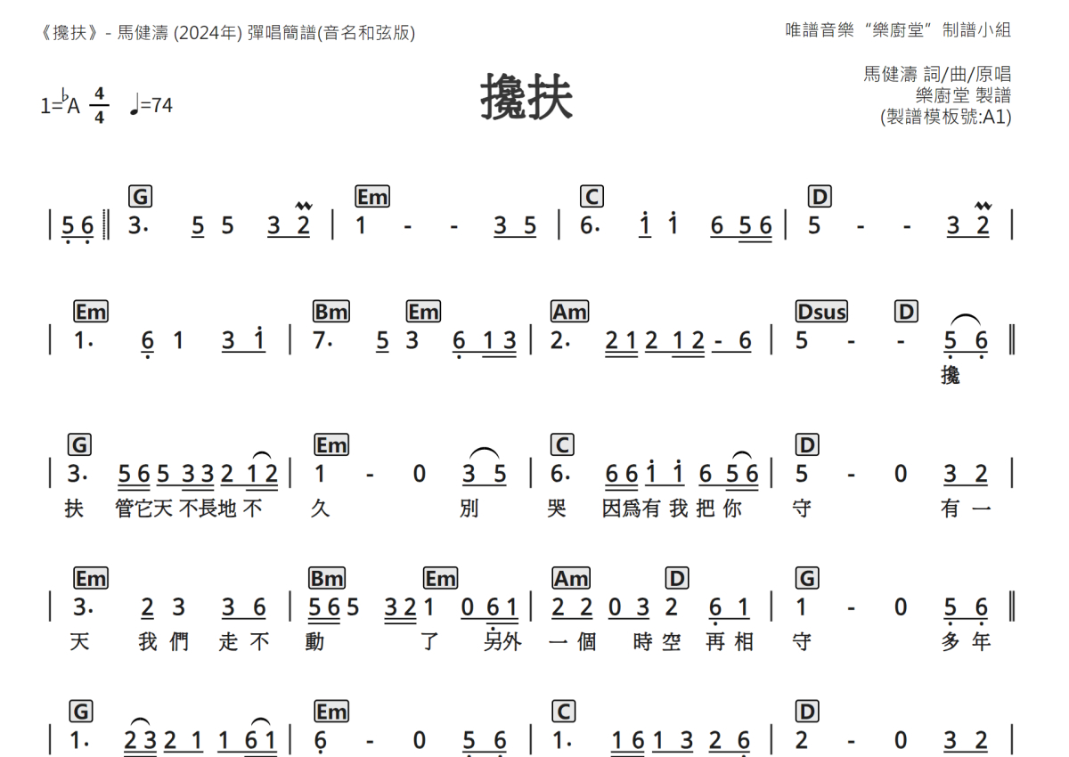 马健涛《搀扶》简谱 - 音名和弦谱