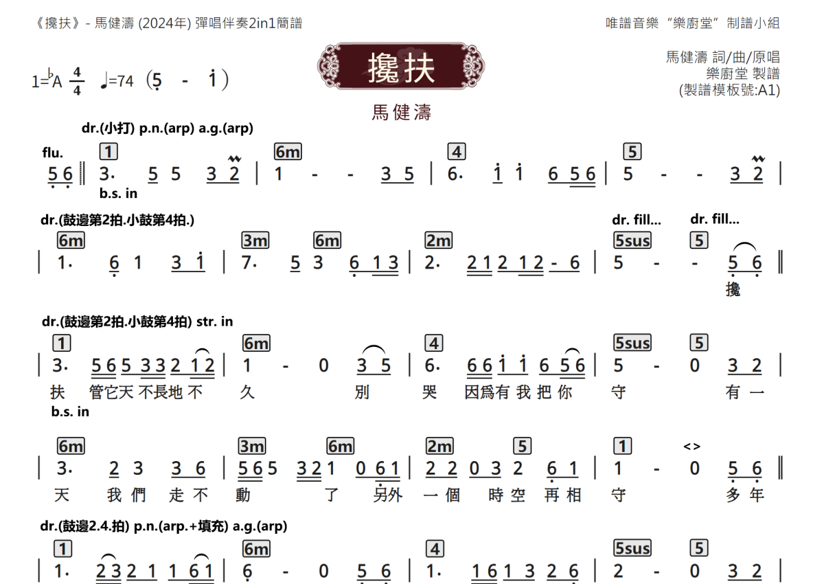 《搀扶》是马健涛演唱的一首歌曲,这份乐队总谱共有两张高清图谱,图谱由 @唯谱音乐"乐厨堂"发布小组 编配上传。