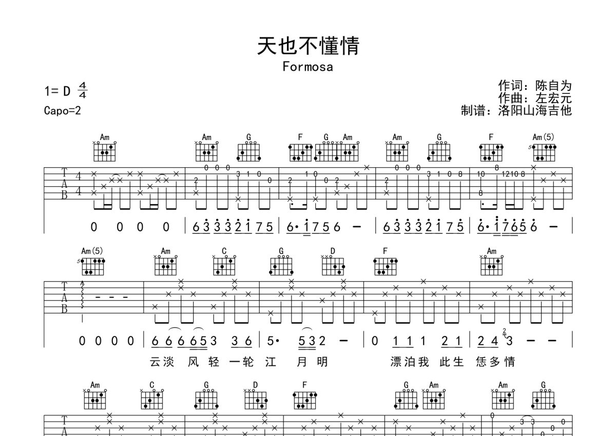 Formosa《天也不懂情》吉他谱 - C调弹唱六线谱