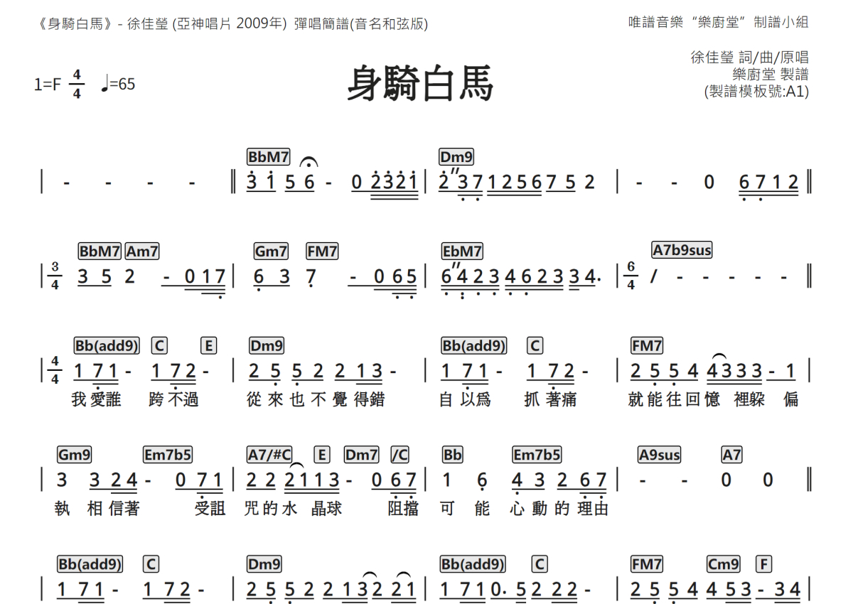 《身骑白马》是徐佳莹演唱的一首歌曲,音名和弦谱,这份简谱共有两张高清图谱,图谱由 @唯谱音乐"乐厨堂"发布小组 编配上传。