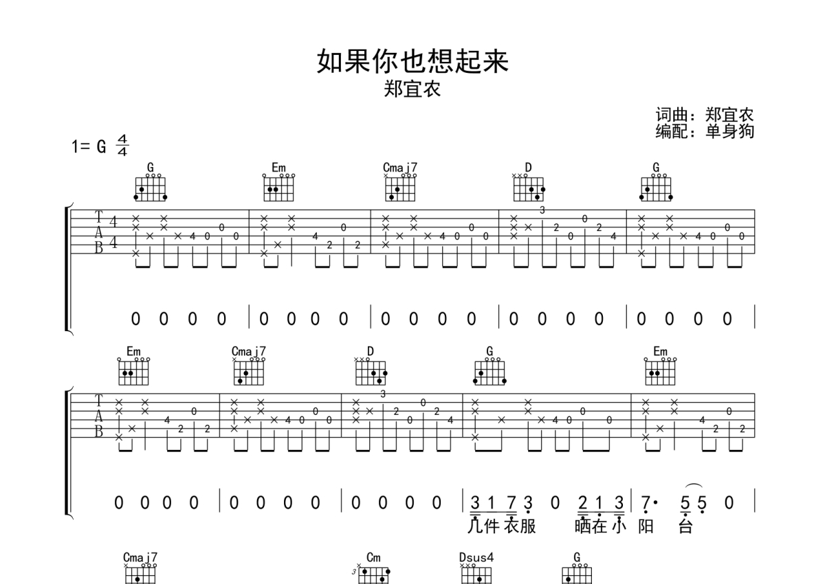 郑宜农《如果你也想起来》吉他谱 - G调弹唱六线谱