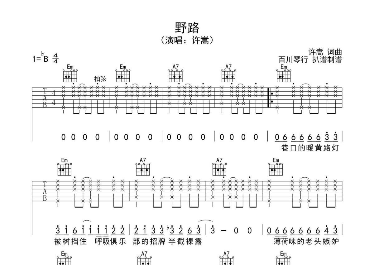 《野路》是许嵩演唱的一首歌曲,拍号为4/4拍,歌曲原调为Bb调,但由于原调指法比较难,为了方便弹奏,本吉他谱采用的是G调指法编配,变调夹3品弹奏即为原调,当然也可以根据自己的音域改变变调夹位置,或者通过改变和弦调性,以方便自己弹奏,这份吉他谱共有三张高清图谱,图谱由 @SRV7758521 编配上传,图谱使用六线谱编配,包含吉他和弦指法、简谱以及歌词部分,使用这份野路吉他谱,可以让你更加方便地掌握这首歌曲的弹唱技巧,快来尝试吧。
