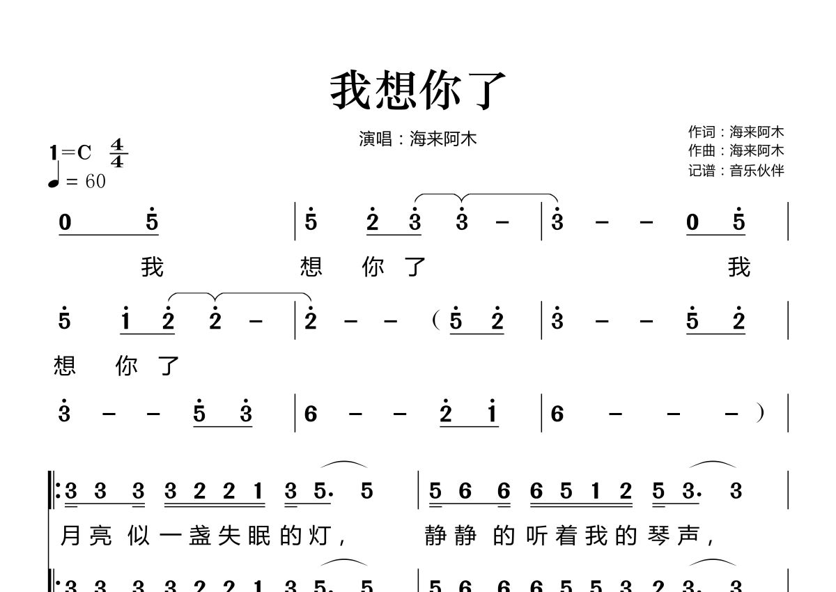 我想你了简谱 - 海来阿木演唱