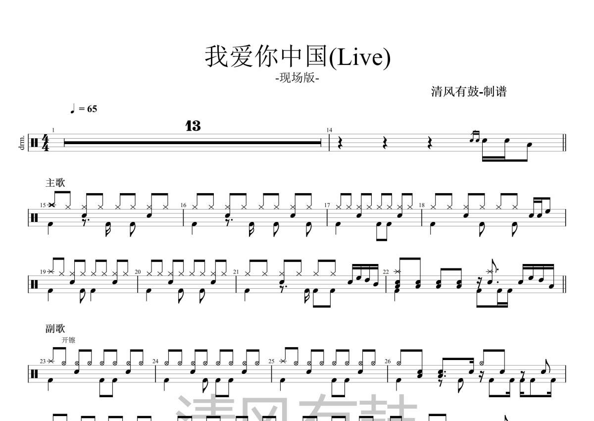 汪峰群星版《我爱你中国- LIVE》架子鼓谱
