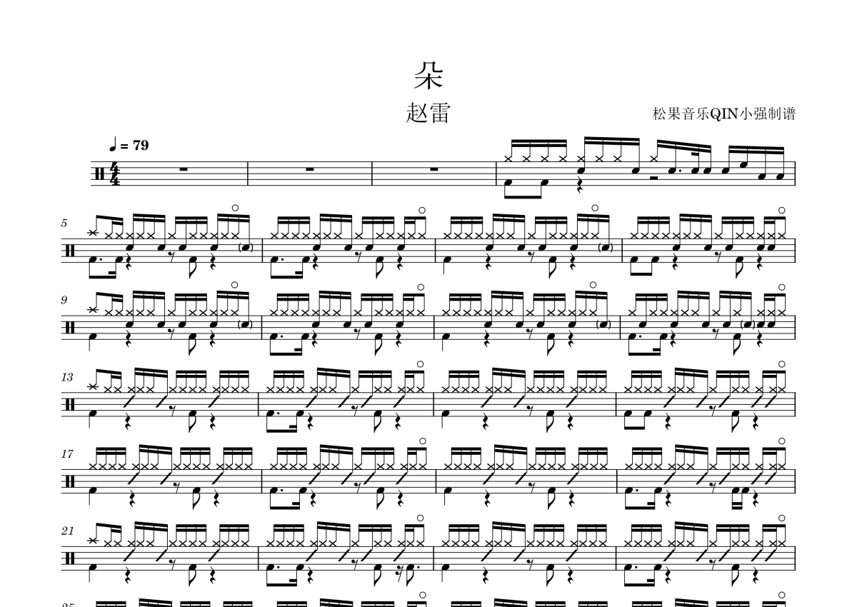《朵》是赵雷演唱的一首歌曲,拍号为4/4拍,这份架子鼓谱共有两张高清图谱,图谱由 @松果音乐QIN小强 编配上传,图谱使用五线谱编配,使用这份朵架子鼓谱,你将能够轻松地敲打出这首赵雷的朵,快来尝试吧。《朵》(Dorr)是赵雷演唱的一首民谣,由赵雷填词、谱曲,赵雷、喜子编曲,收录在赵雷第四张个人专辑《无法长大》中,专辑发行时间于2016年12月21日。