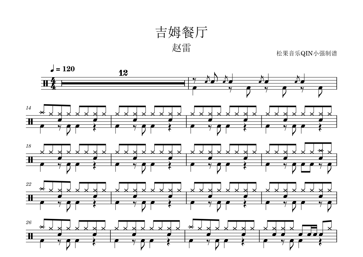 《吉姆餐厅》是赵雷演唱的一首歌曲,拍号为4/4拍,这份架子鼓谱共有四张高清图谱,图谱由 @松果音乐QIN小强 编配上传,图谱使用五线谱编配,使用这份吉姆餐厅架子鼓谱,你将能够轻松地敲打出这首赵雷的吉姆餐厅,快来尝试吧。《吉姆餐厅》是赵雷的一首原创歌曲,收录于其同名专辑《吉姆餐厅》,于2014年10月19日发行。