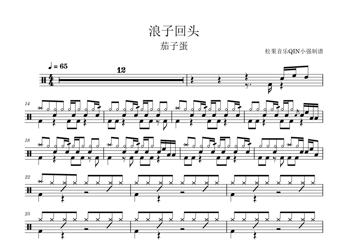 《浪子回头》是茄子蛋演唱的一首歌曲,拍号为4/4拍,这份架子鼓谱共有两张高清图谱,图谱由 @松果音乐QIN小强 编配上传,图谱使用五线谱编配,使用这份浪子回头架子鼓谱,你将能够轻松地敲打出这首茄子蛋的浪子回头,快来尝试吧。《浪子回头》是由黄奇斌创作词曲、茄子蛋演唱的歌曲,收录于茄子蛋2013年7月25日发行的EP《犹原伫这》中 。2017年7月28日,该曲重新录制发行,收录于茄子蛋发行的专辑《卡通人物》中。