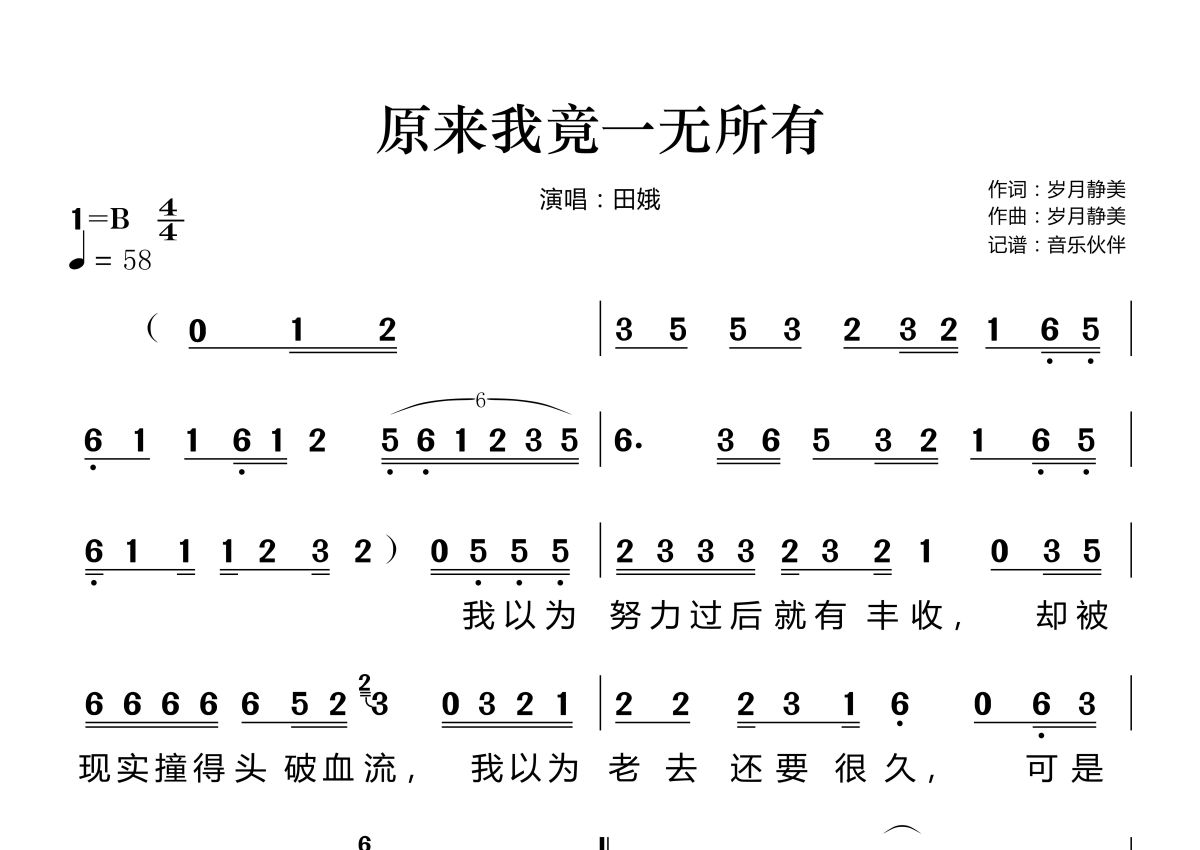 《原来我竟一无所有》是田娥演唱的一首歌曲,拍号为4/4拍,歌曲速度为每分钟58拍,这份简谱共有两张高清图谱,图谱由 @音乐伙伴 编配上传。
