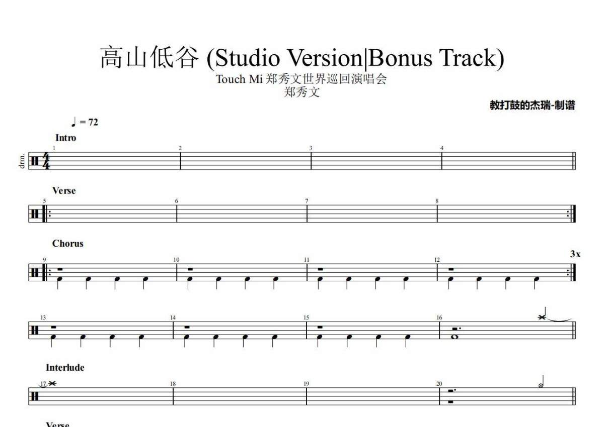 郑秀文《高山低谷 (Studio Version|Bonus Track)》架子鼓谱 - Touch Mi 郑秀文世界巡回演唱会