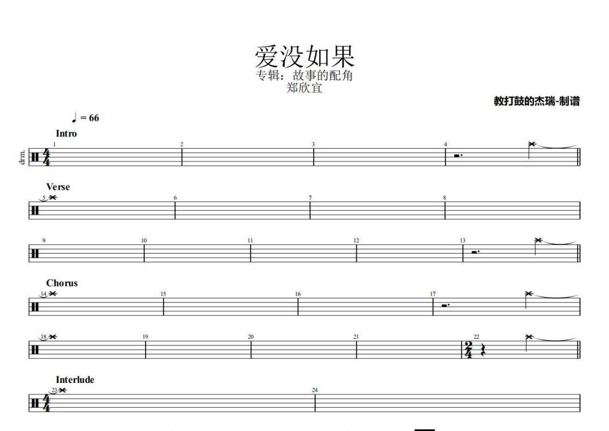 《爱没如果》是郑欣宜演唱的一首歌曲,拍号为4/4拍,歌曲速度为每分钟66拍,这份架子鼓谱共有两张高清图谱,图谱由 @Jerry 编配上传,图谱使用五线谱编配,使用这份爱没如果架子鼓谱,你将能够轻松地敲打出这首郑欣宜的爱没如果,快来尝试吧。