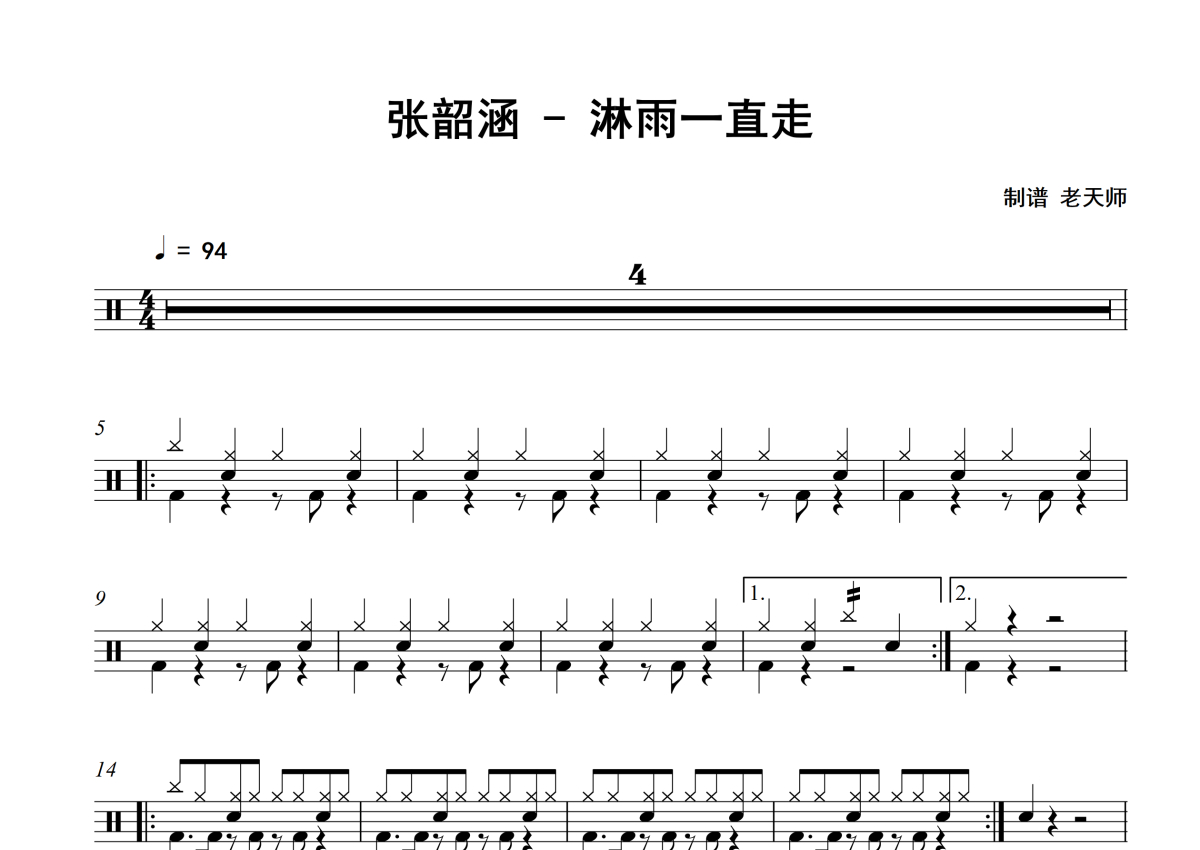 《淋雨一直走》是张韶涵演唱的一首歌曲,拍号为4/4拍,歌曲速度为每分钟94拍,这份架子鼓谱共有两张高清图谱,图谱由 @172****8519 编配上传,图谱使用五线谱编配,使用这份淋雨一直走架子鼓谱,你将能够轻松地敲打出这首张韶涵的淋雨一直走,快来尝试吧。