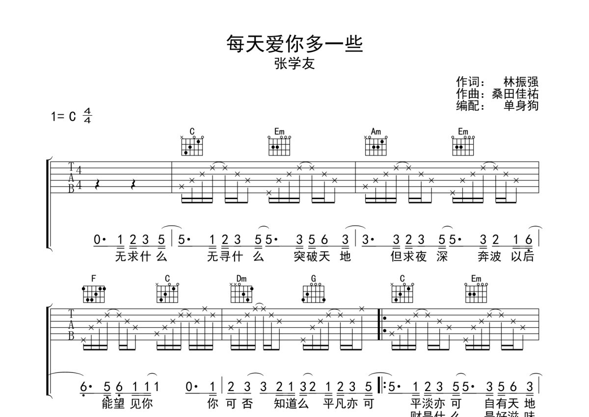 张学友《每天爱你多一些》吉他谱 - C调弹唱六线谱