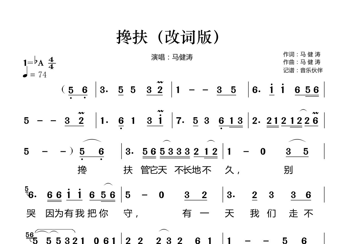 《搀扶》是改词版演唱的一首歌曲,(改词版),拍号为4/4拍,歌曲速度为每分钟74拍,这份简谱共有两张高清图谱,图谱由 @音乐伙伴 编配上传。