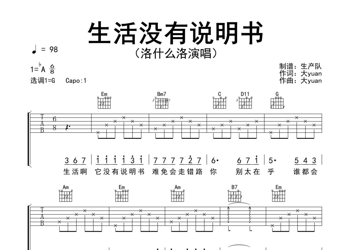 《生活没有说明书》是洛什么洛演唱的一首歌曲,精编完美版,拍号为6/8拍,歌曲速度为每分钟98拍,歌曲原调为Ab调,但由于原调指法比较难,为了方便弹奏,本吉他谱采用的是G调指法编配,变调夹1品弹奏即为原调,当然也可以根据自己的音域改变变调夹位置,或者通过改变和弦调性,以方便自己弹奏,这份吉他谱共有三张高清图谱,图谱由 @生产队 编配上传,图谱使用六线谱编配,包含吉他和弦指法、简谱以及歌词部分,使用这份生活没有说明书吉他谱,可以让你更加方便地掌握这首歌曲的弹唱技巧,快来尝试吧。洛什么洛演唱的歌曲《生活没有说明书》原版吉他谱,精准的间奏,尾奏solo编配,精编完美版,值得推荐!。