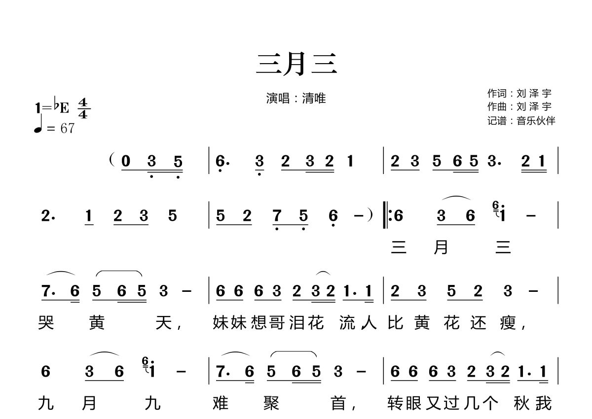 《三月三》是清唯演唱的一首歌曲,拍号为4/4拍,歌曲速度为每分钟67拍,这份简谱共有两张高清图谱,图谱由 @音乐伙伴 编配上传。