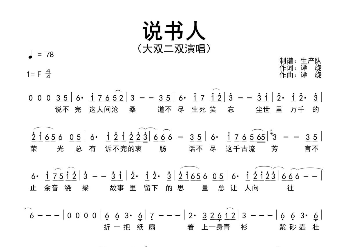《说书人》是大双二双演唱的一首歌曲,原版简谱,拍号为4/4拍,歌曲速度为每分钟78拍,这份简谱共有一张高清图谱,图谱由 @生产队 编配上传大双二双演唱的歌曲《说书人》原版简谱,精编完美版,值得推荐。