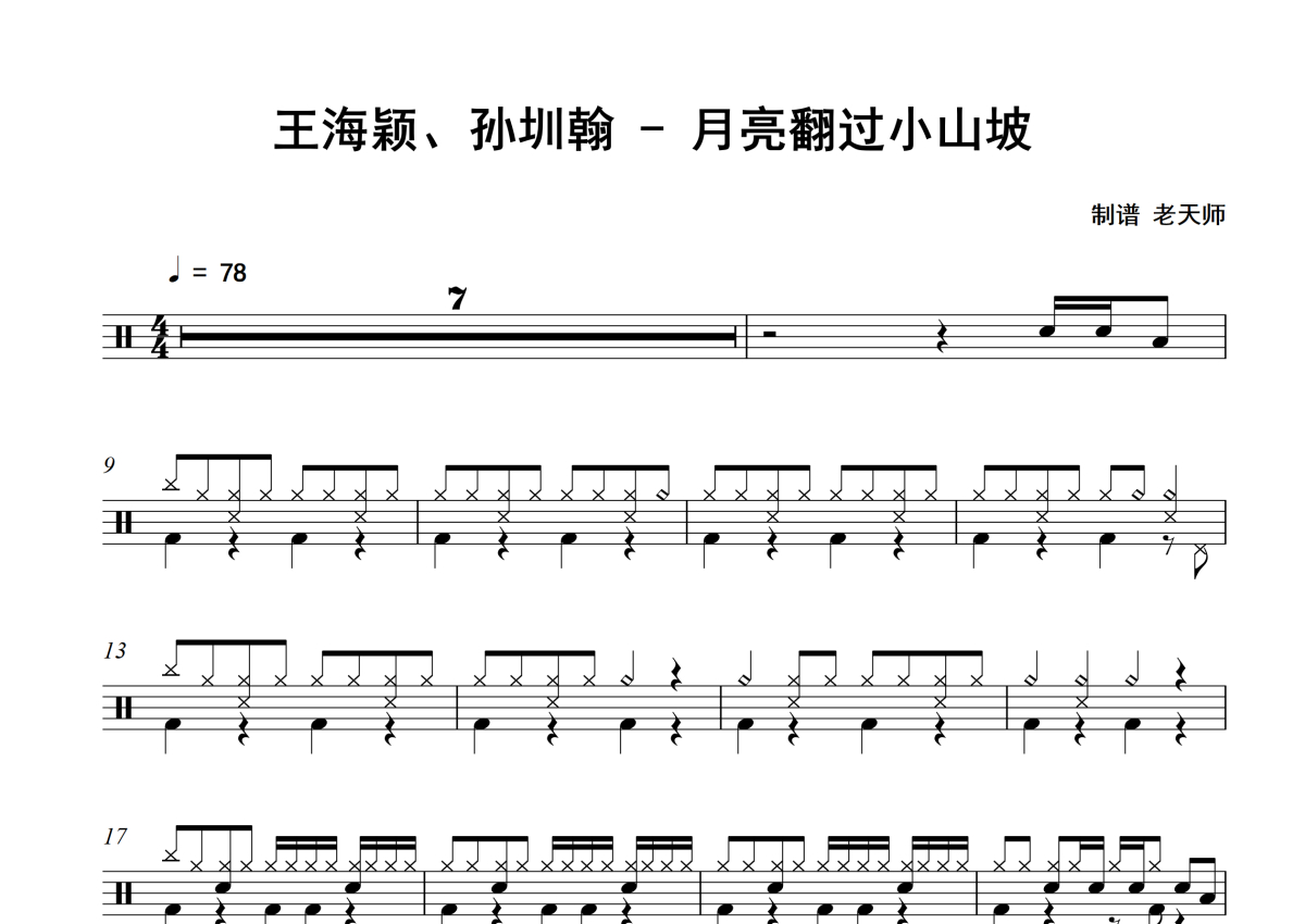 《月亮翻过小山坡》是王海颖、孙圳翰演唱的一首歌曲,拍号为4/4拍,歌曲速度为每分钟78拍,这份架子鼓谱共有两张高清图谱,图谱由 @172****8519 编配上传,图谱使用五线谱编配,使用这份月亮翻过小山坡架子鼓谱,你将能够轻松地敲打出这首王海颖、孙圳翰的月亮翻过小山坡,快来尝试吧。