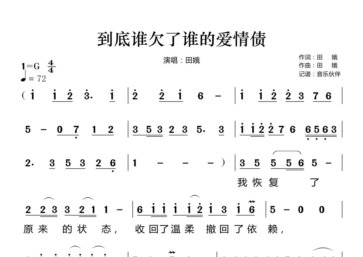 《到底谁欠了谁的爱情债》是田娥演唱的一首歌曲,拍号为4/4拍,歌曲速度为每分钟72拍,这份简谱共有两张高清图谱,图谱由 @音乐伙伴 编配上传。