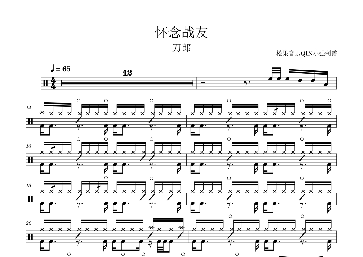 《怀念战友》是刀郎演唱的一首歌曲,拍号为4/4拍,这份架子鼓谱共有三张高清图谱,图谱由 @松果音乐QIN小强 编配上传,图谱使用五线谱编配,使用这份怀念战友架子鼓谱,你将能够轻松地敲打出这首刀郎的怀念战友,快来尝试吧。《怀念战友》歌手:刀郎 所属专辑:披着羊皮的狼。