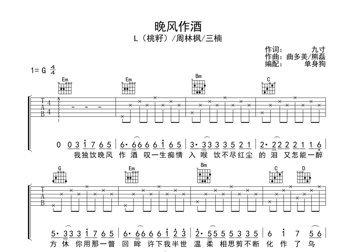 L(桃籽)/周林枫/三楠《晚风作酒》吉他谱 - G调弹唱六线谱