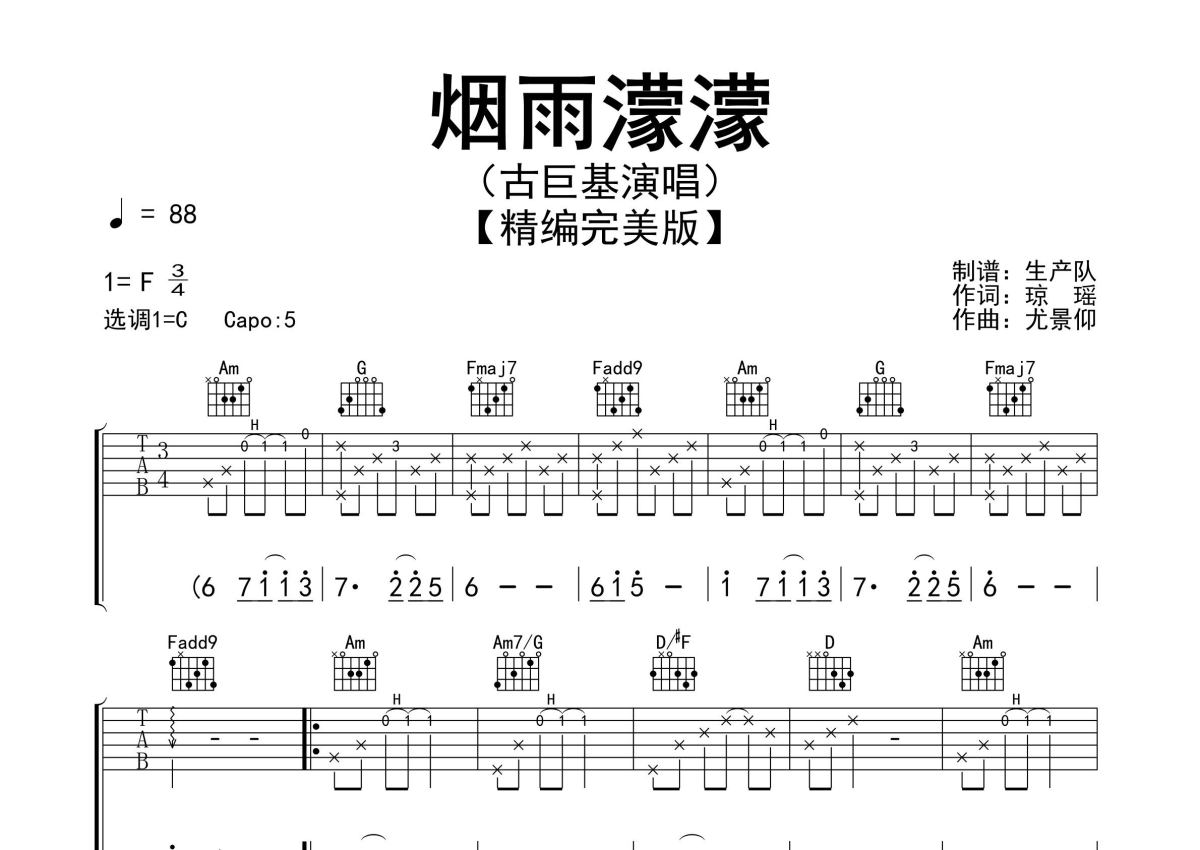 《烟雨濛濛》是古巨基演唱的一首歌曲,精编完美版,拍号为3/4拍,歌曲速度为每分钟88拍,歌曲原调为F调,但由于原调指法比较难,为了方便弹奏,本吉他谱采用的是C调指法编配,变调夹5品弹奏即为原调,当然也可以根据自己的音域改变变调夹位置,或者通过改变和弦调性,以方便自己弹奏,这份吉他谱共有两张高清图谱,图谱由 @生产队 编配上传,图谱使用六线谱编配,包含吉他和弦指法、简谱以及歌词部分,使用这份烟雨濛濛吉他谱,可以让你更加方便地掌握这首歌曲的弹唱技巧,快来尝试吧。古巨基演唱的经典歌曲《烟雨濛濛》原版吉他谱,精准的前奏、间奏、尾奏solo编配,精编完美版,值得推荐!。
